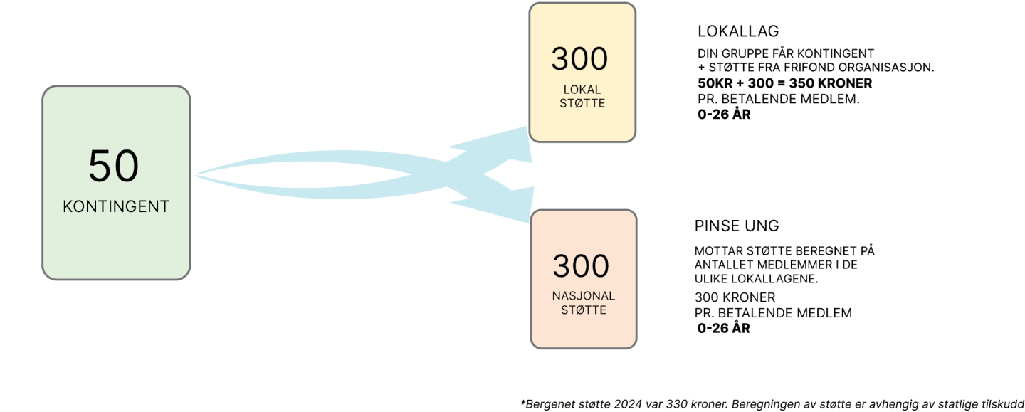 Kontingenten som hentes inn fra de i din gruppe i år, er utgangspunktet for årsrapporten dere leverer inn i mars neste år. Kontigenten må være på minimum kr 50,- , og gulroten er at den 50-lappen dere henter inn, blir til ca kr 350,- når frifondstøtten fordeles. Derfor sier vi 50=350. I tillegg får Pinse Ung sentralt ca. 300 kroner pr. betalende medlem, derfor vil i realiteten den 50-lappen utgjøre over 600 kroner i utbetalt støtte